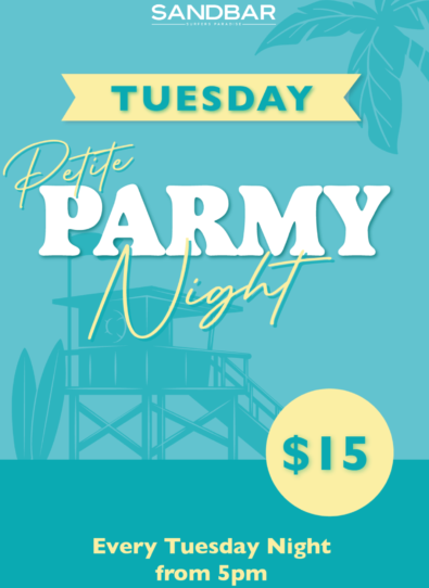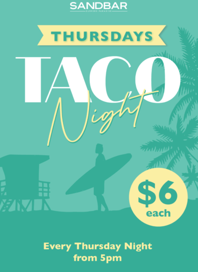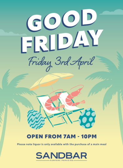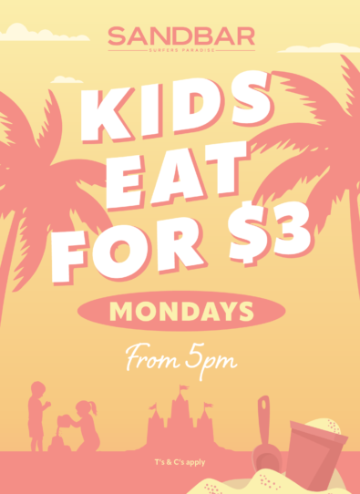 Sandbar wants you to wine, dine and take your time. Relax and let our friendly staff pour you a delicious cocktail, sublime wine or crisp ale from the Gold Coast’s largest range of beers. We focus on offering quality breakky favourites, gourmet burgers, fish’n’chips, steaks, seafood and more.
